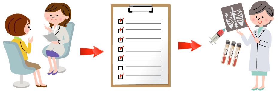 1 治療への第1段階はリウマチを専門とする医師により、状況を把握するために患者さんからお話をうかがう問診と、血液検査をはじめとするいろいろな検査を行います。